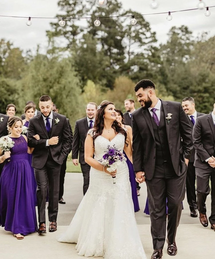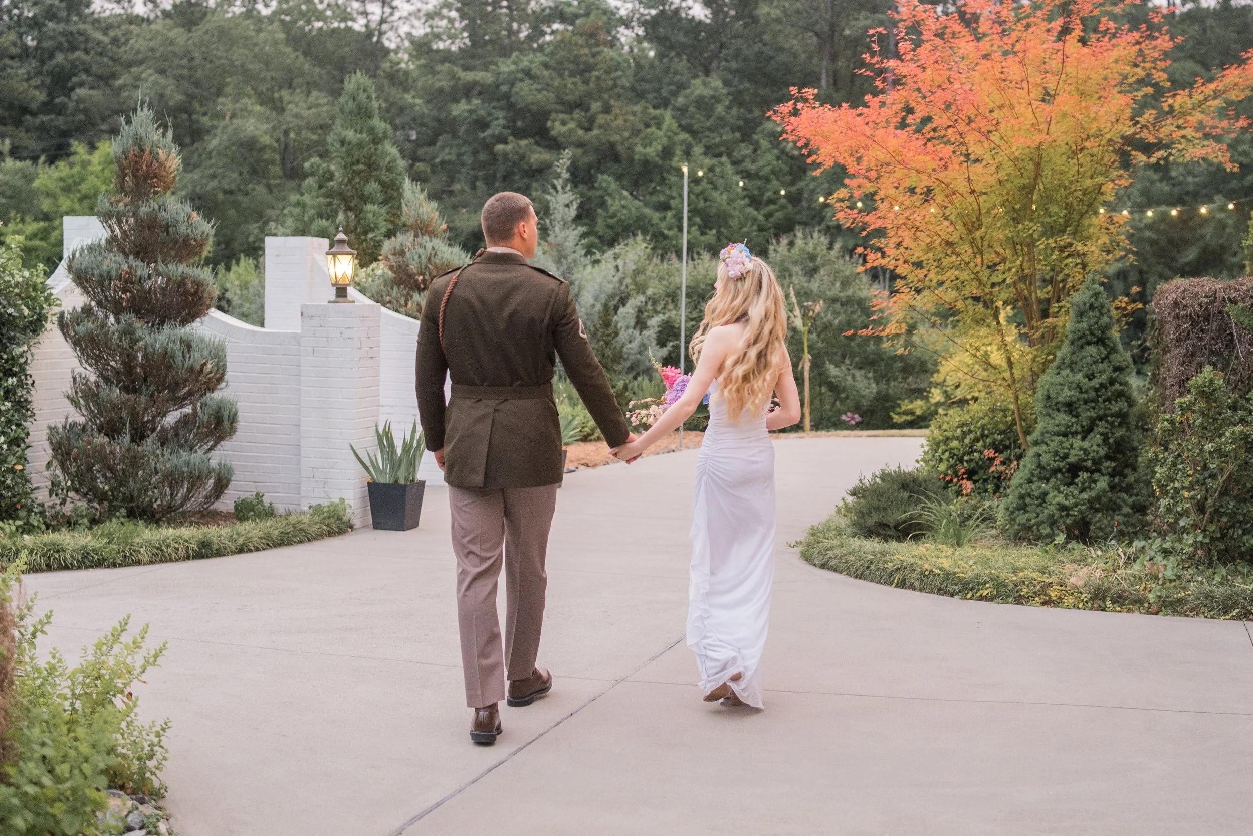 A bride and groom walking outdoors hand in hand, with the bride in a white dress and veil, and the groom in a blue suit. They are smiling, surrounded by greenery and a white building in the background.