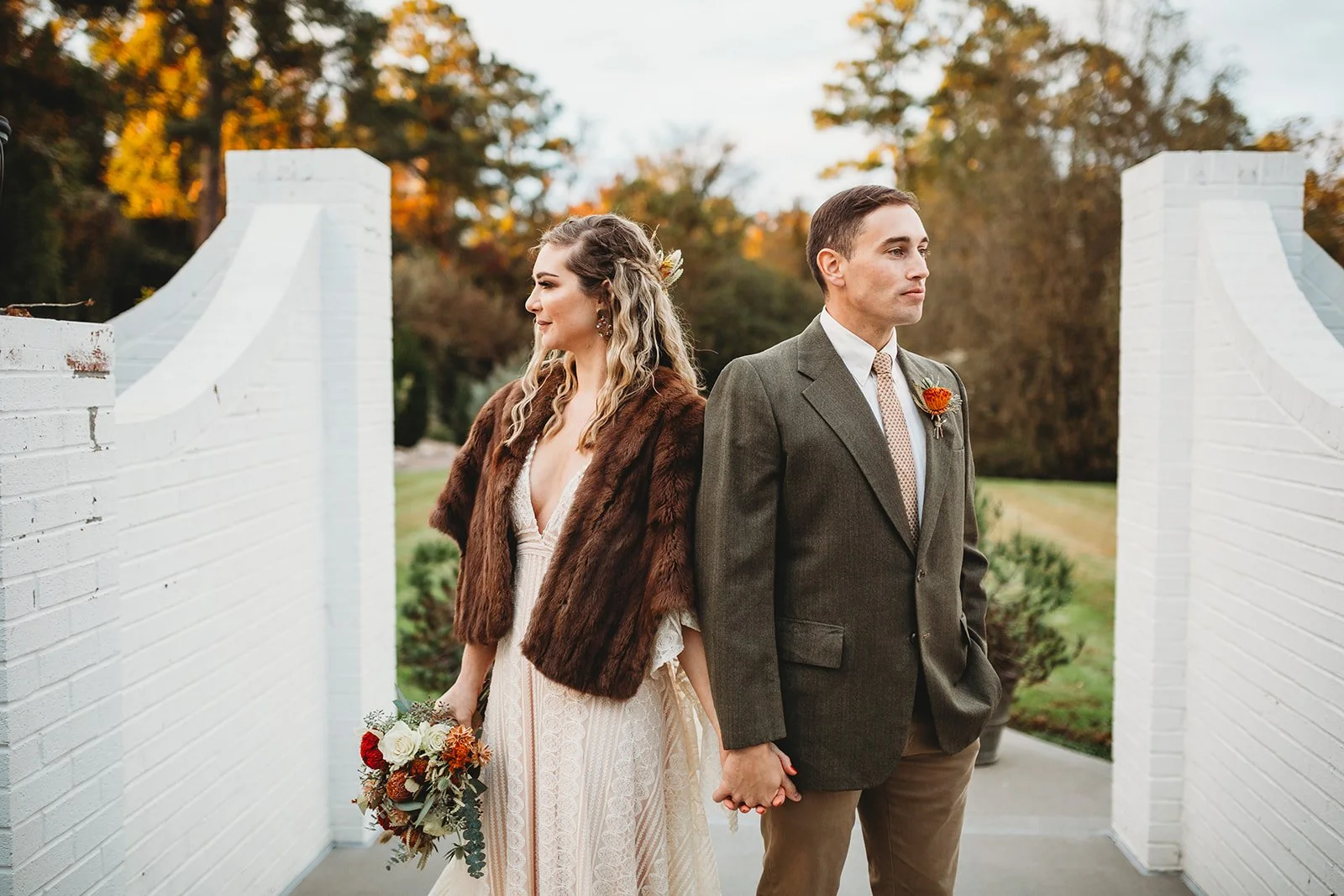 Bride and groom in formal attire posing outdoors with greenery and string lights, white brick building in background.