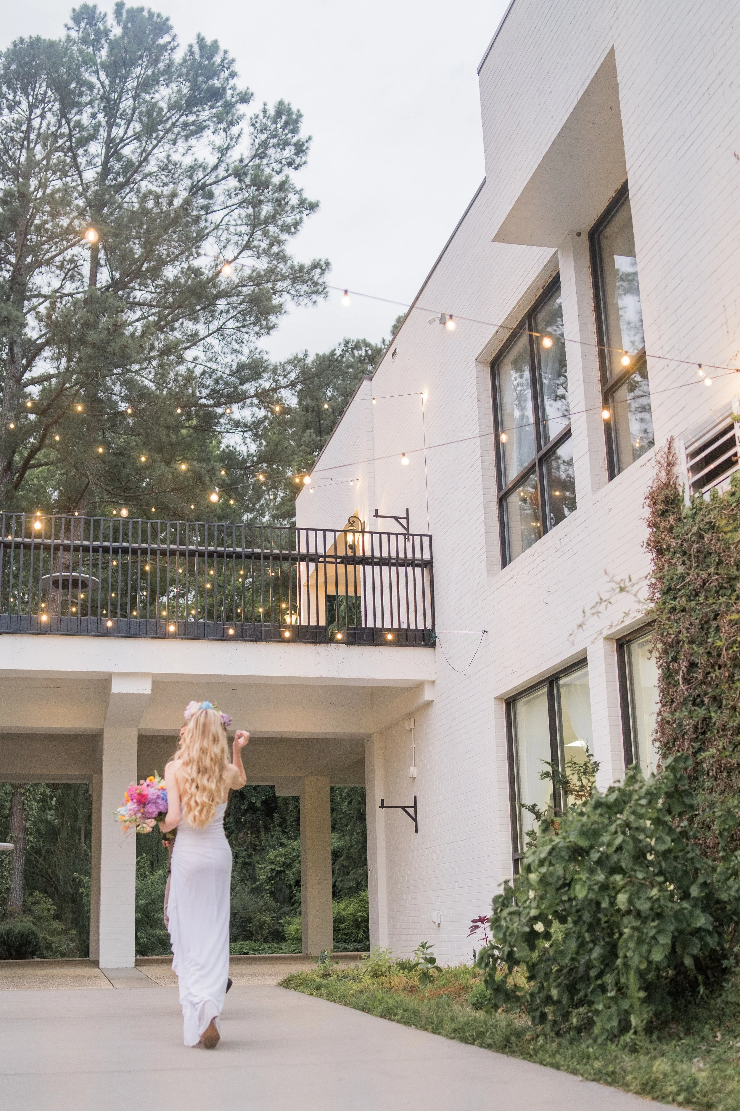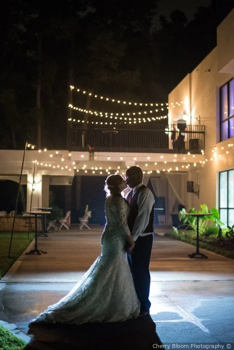 Bride and groom in formal attire posing outdoors with greenery and string lights, white brick building in background. View fullsize