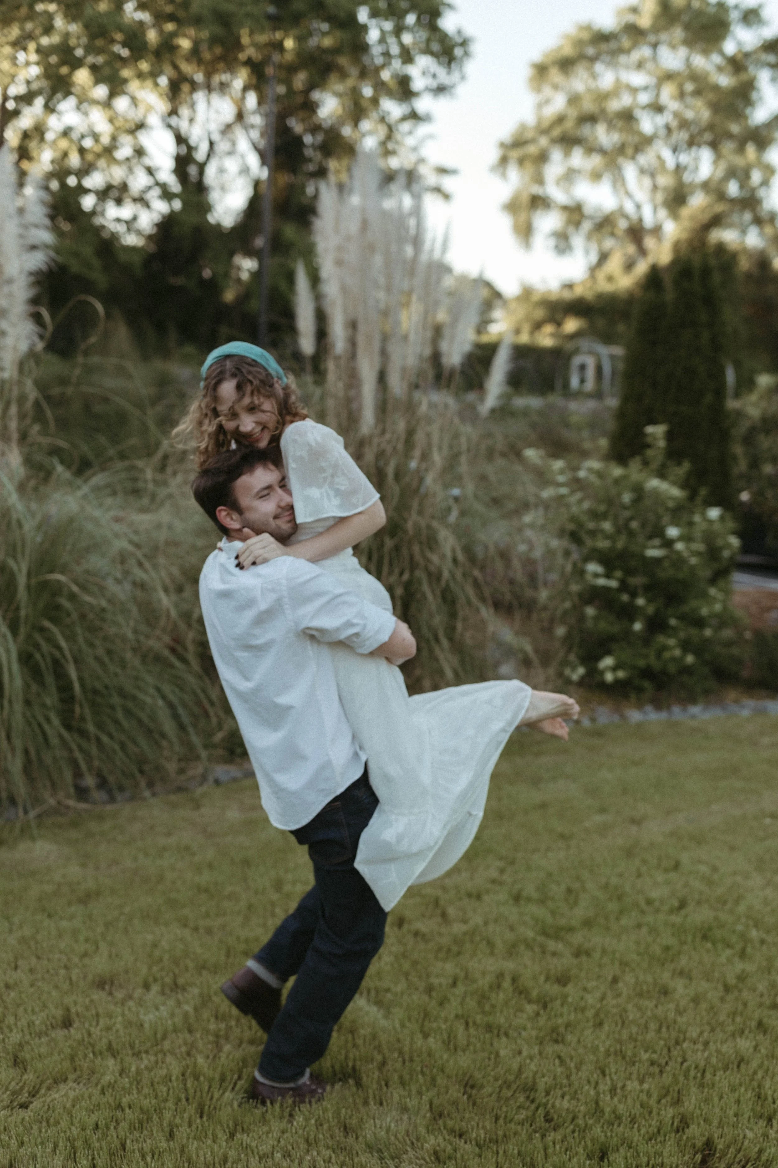 Couple sitting on outdoor steps surrounded by greenery, with sunlight streaming in from behind them. The woman is holding a bouquet of flowers. View fullsize