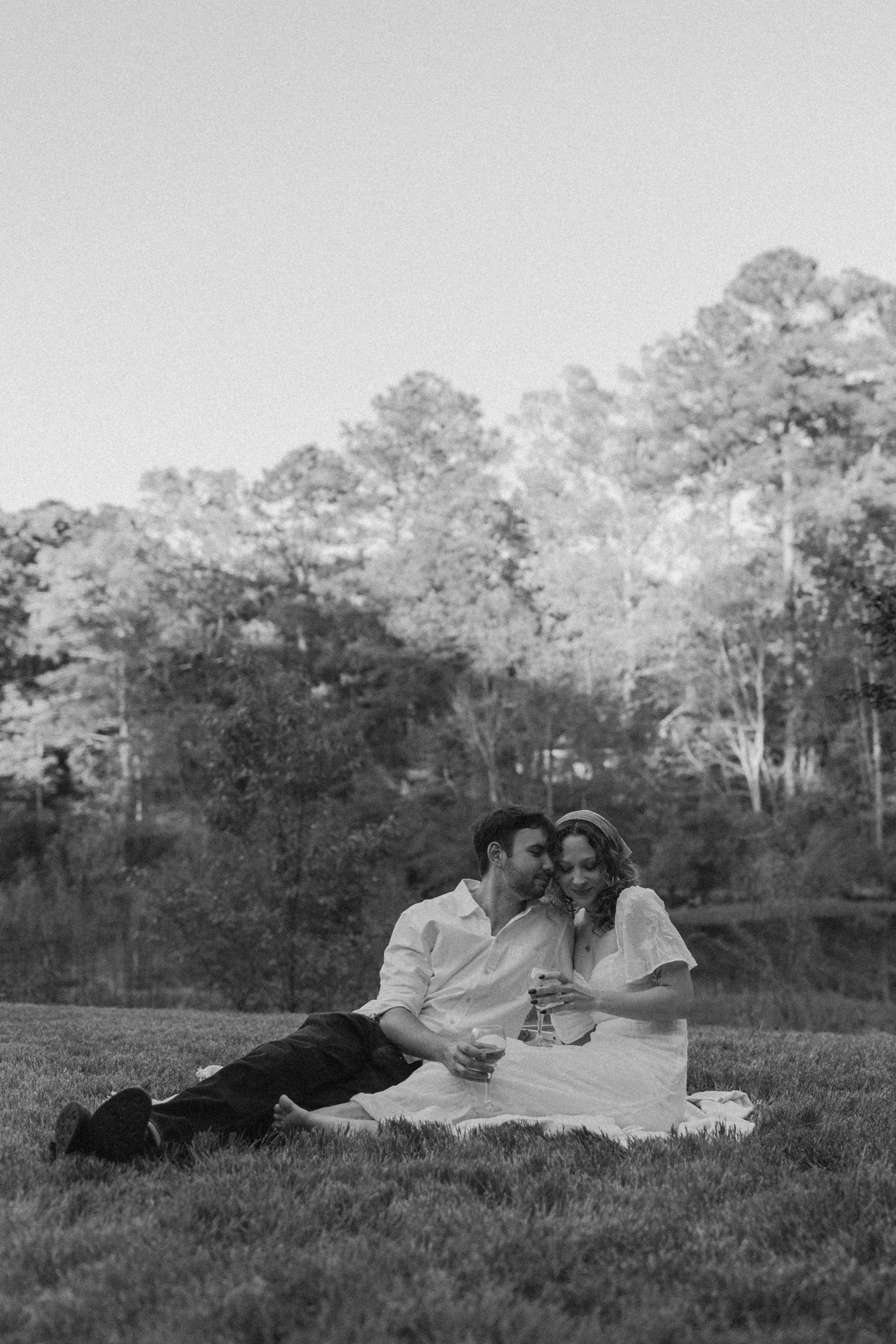 Playful bride and groom showing rings and making faces, black and white, outdoor wedding.