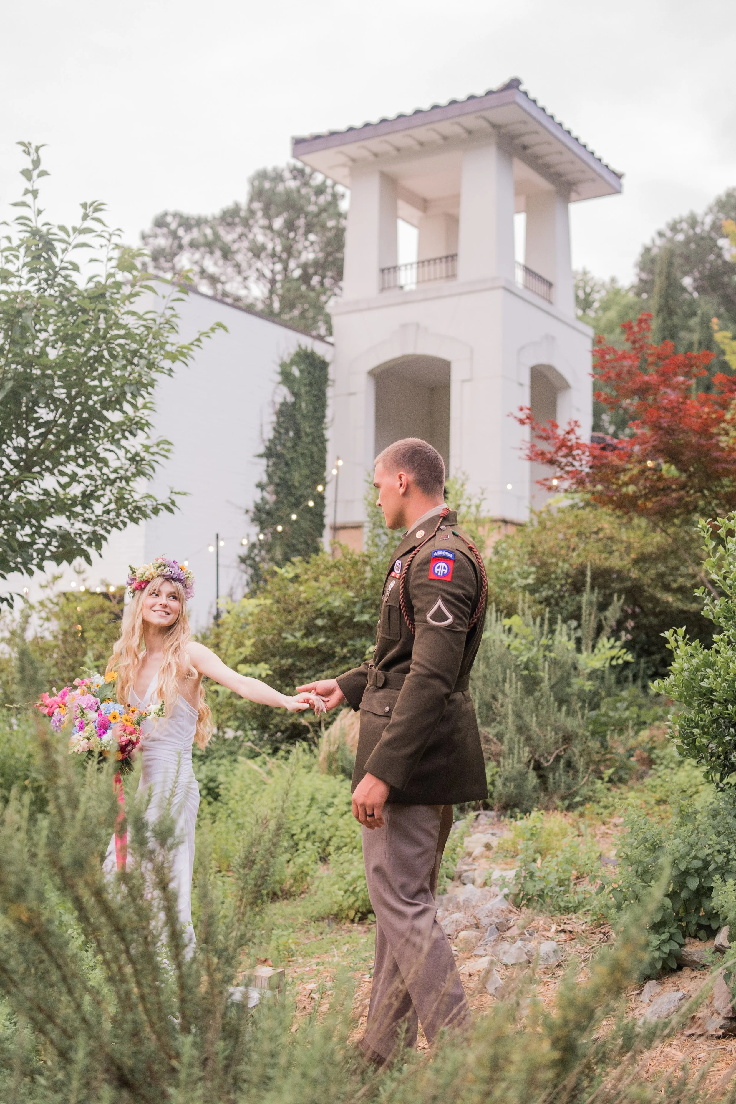 A black and white photo of a happy couple embracing outdoors. The woman, wearing a flower crown and dress, smiles broadly as the man, in a military uniform, leans in close. A tall building and lush greenery are visible in the background. View fullsize