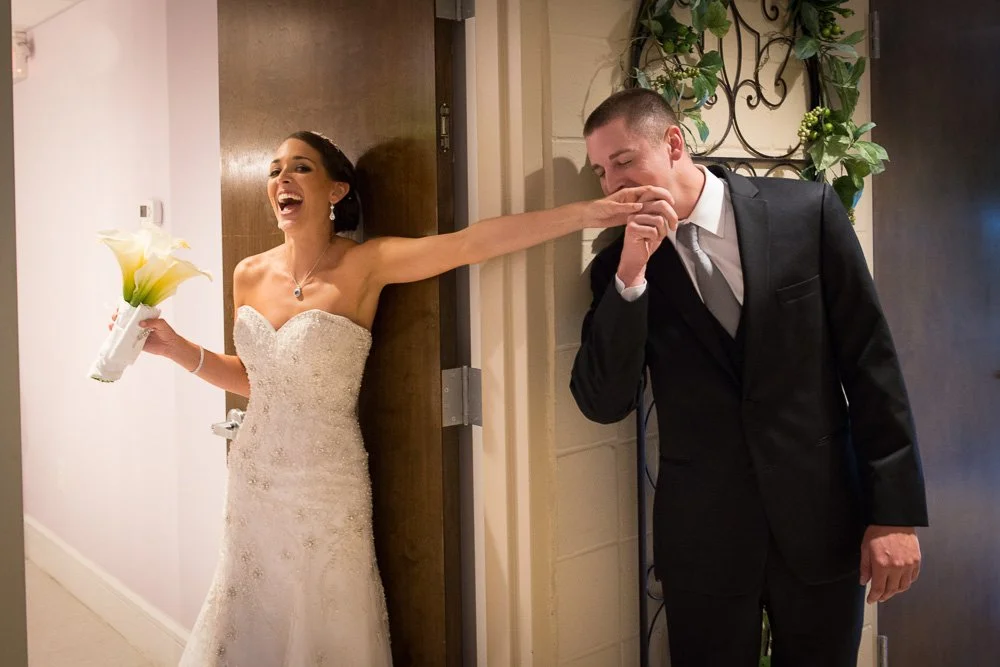 Couple kissing inside a window at a wedding venue, framed by draped curtains and ivy on the building façade.
