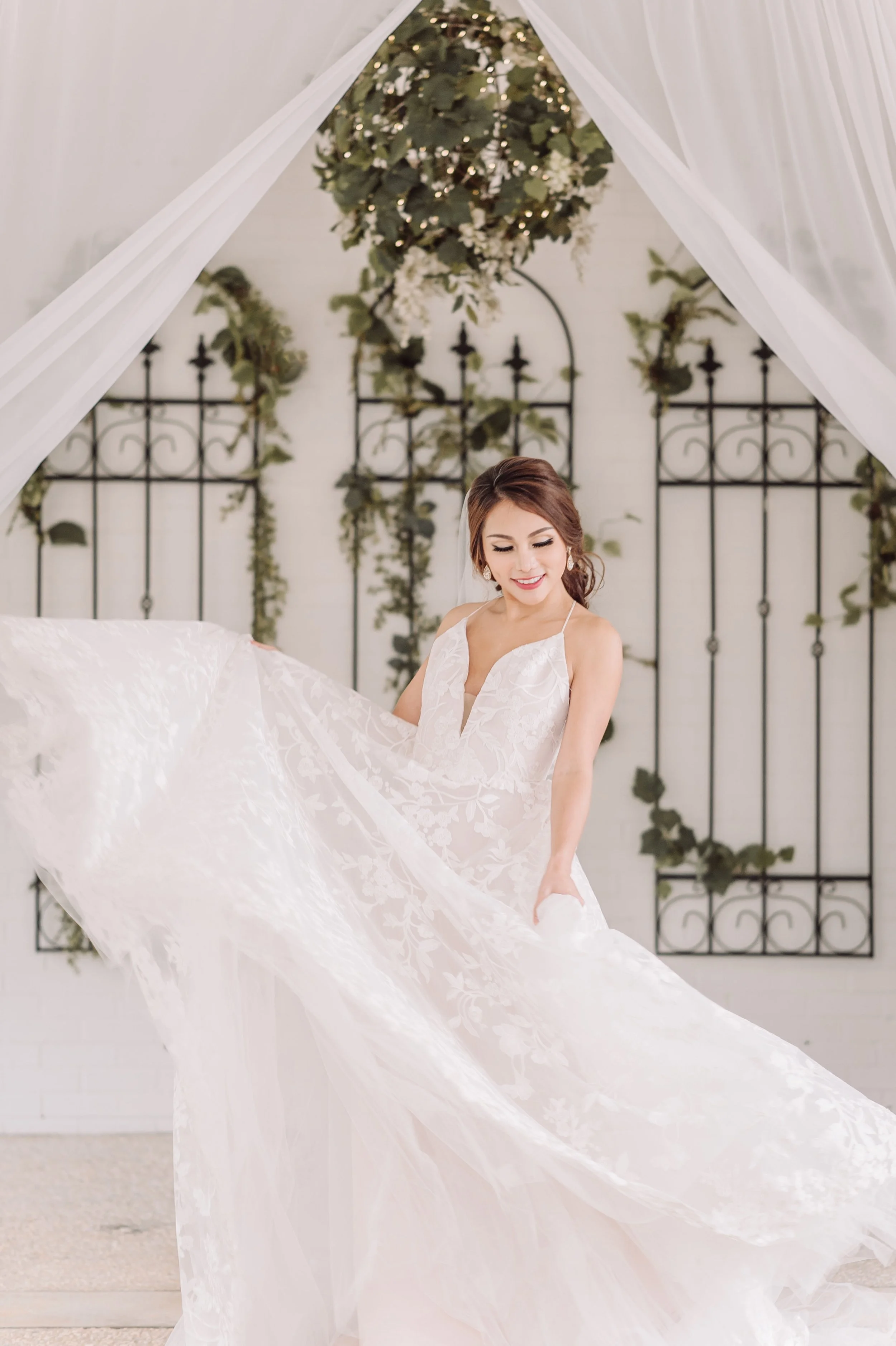 Bride in a white floral lace wedding dress and tiara posing outside near a white wall.