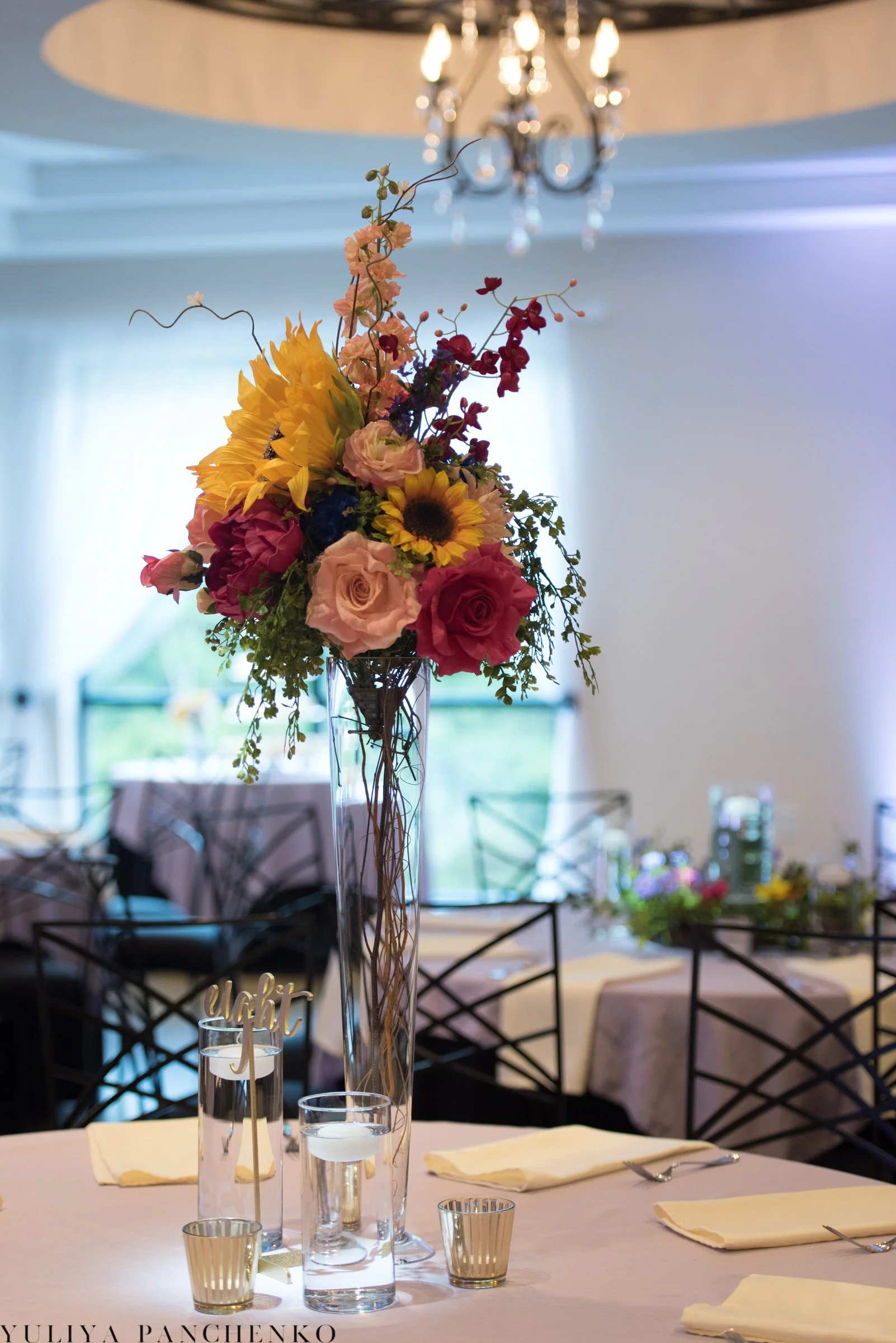 Elegant wedding reception hall with tables set for dinner, featuring black and white decor, tall floral centerpieces with white roses and green leaves, and ambient lighting.